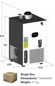 | Specs Compressor HP: 1/2 Cooling Power WATT: 849 (730 Kal/h) Input power W: 650 Volt – Hertz: 230 – 50/60 Water tank capacity (lt): 48 Ice Bank KG: 22 (1760 Kcal) Output per minute 200 cc 24°C (ambient temperature): 7 Beverage outlet temperature: 3/5°C Litres that can be chilled till complete depletion of ice bank, at different temperatures of beer in keg: 16°C-147 24°C-88 32°C-63 43°C-45 Max no. of beer coils: 5 Dimensions Shipping Weight |